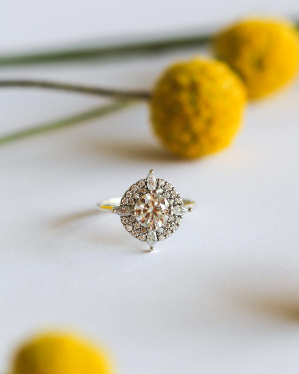 Oval Bezel Encrusted Floral Moissanite Engagement Ring