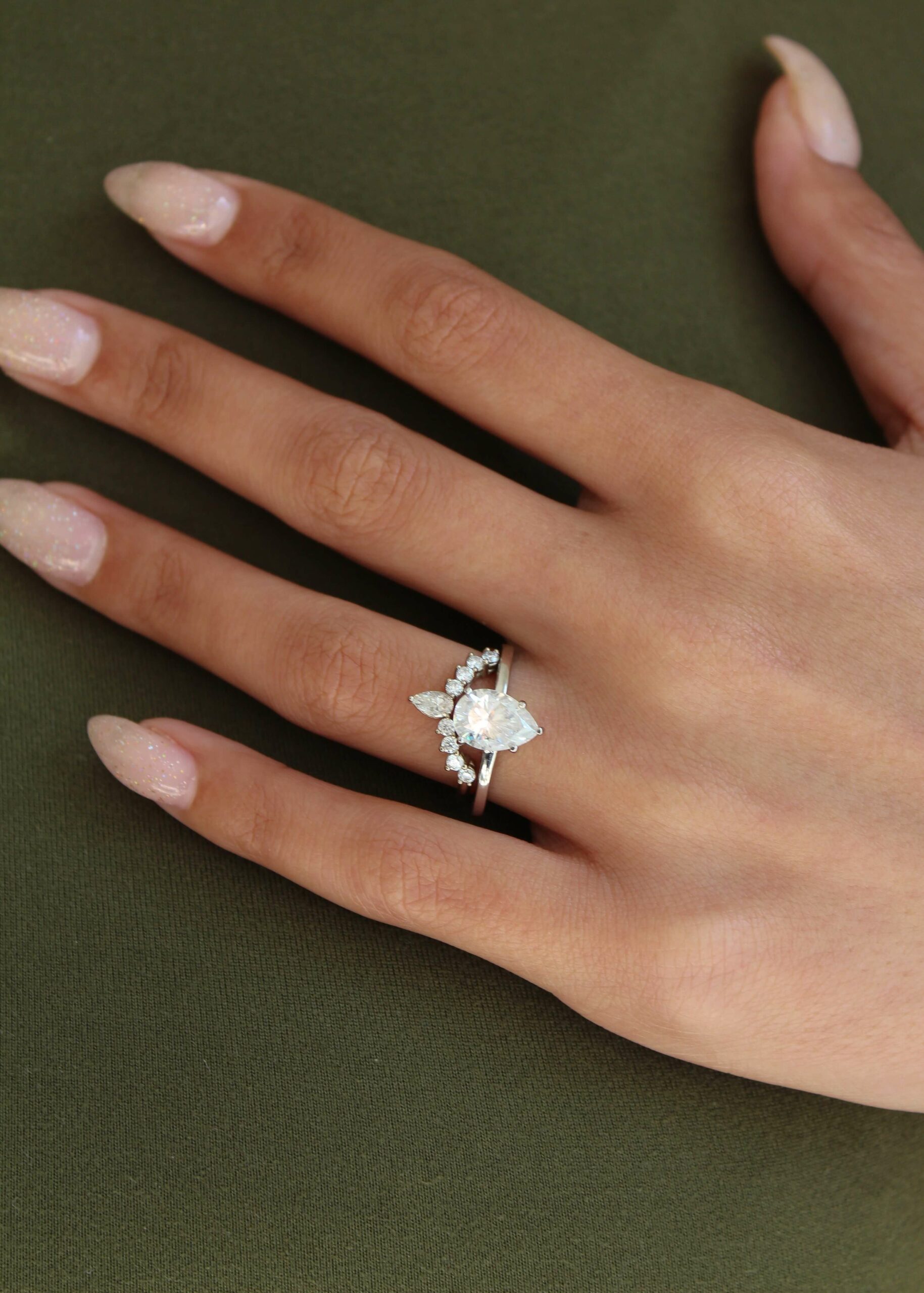 A classic yet modern 2.5ct Pear solitaire engagement ring matched with a beautiful wedding band, lined with stunning round brilliant cut moissanites leading to a central marquise cut moissanite in the perfect crown shape.