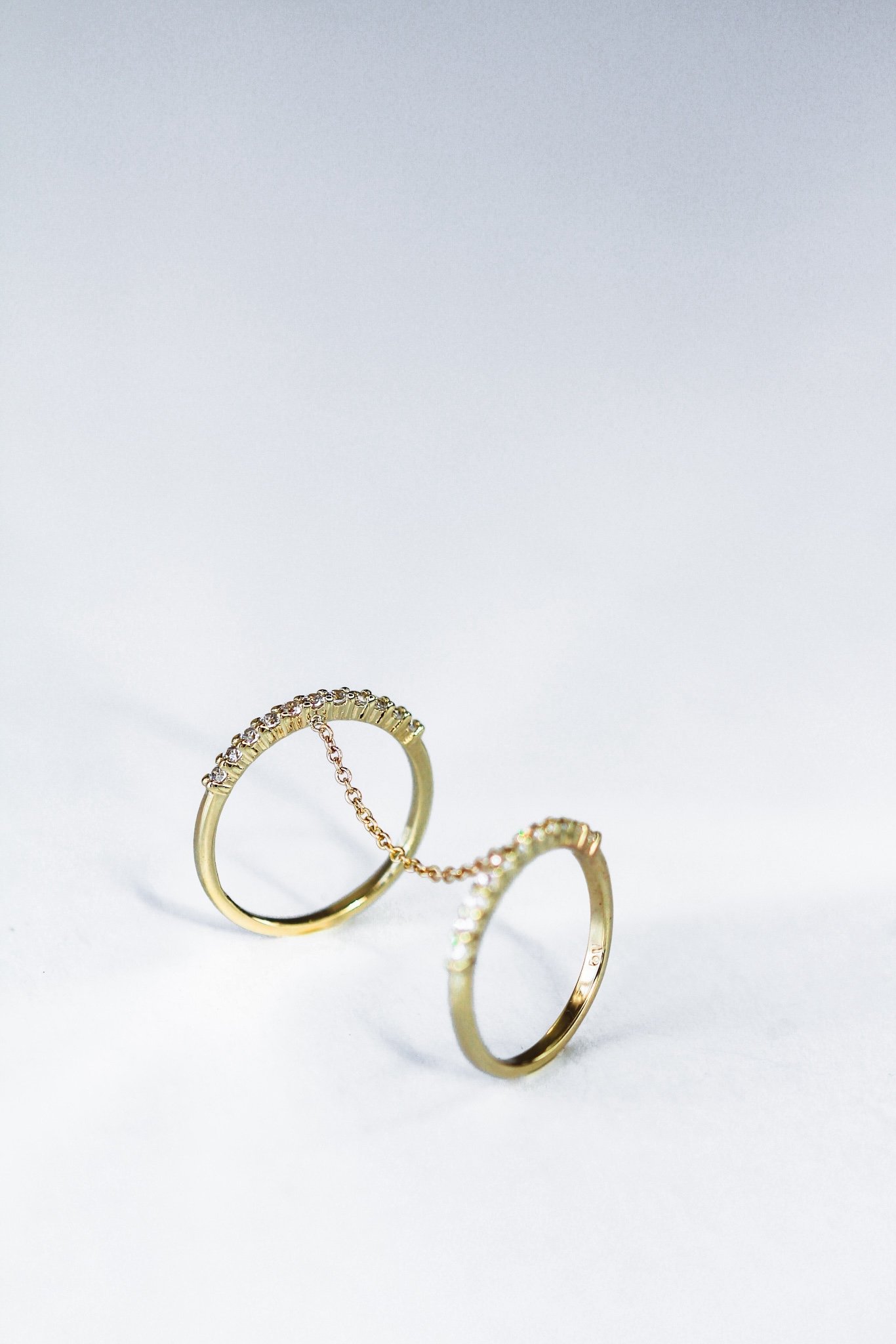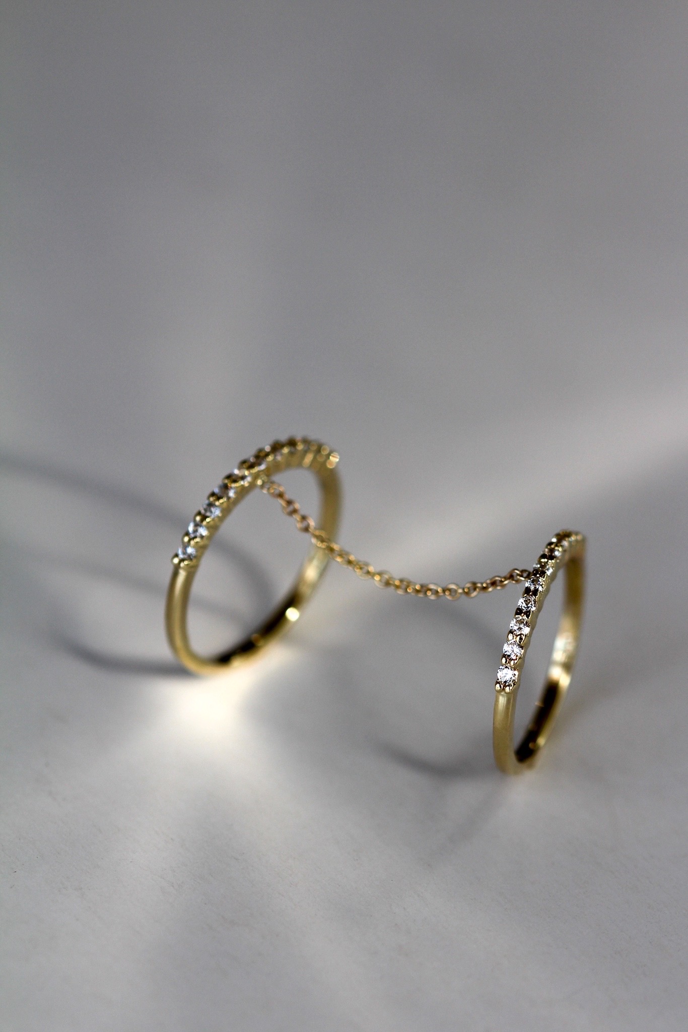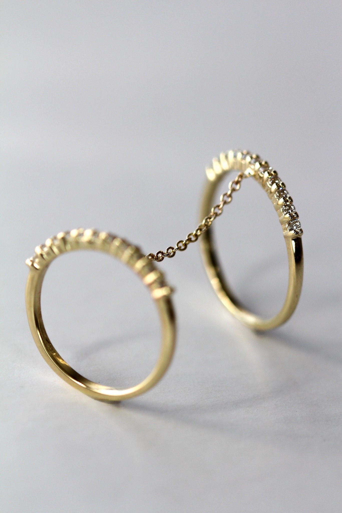 With one Moissanite band a bit smaller than the other, its secured by a petite yellow gold chain which creates a drama that accentuate your fingers!