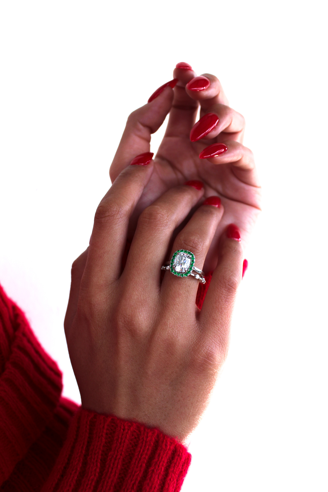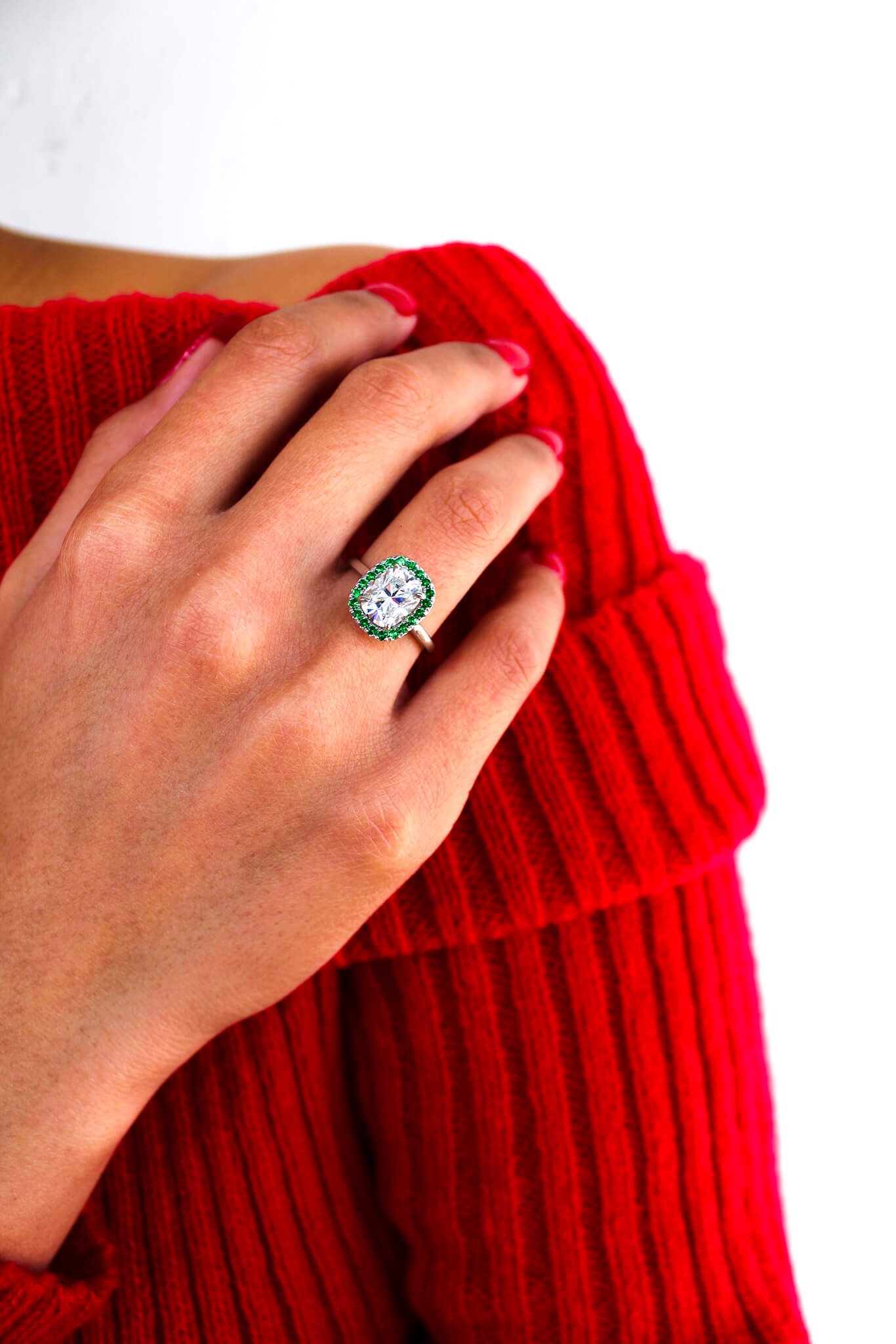 For the ultimate expression of love personalise it with any coloured gemstones such as stunning green round brilliant moissanites that is a lover of greens ultimate dream.