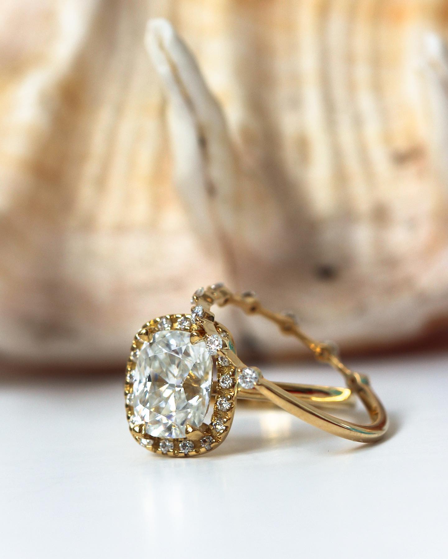 Your ring set is made to order. Turnaround time is 3-4 weeks. This Elongated Cushion Ring Set can be made in any size, please send us a note at checkout, with your ring size.- Metal: Solid 9ct Yellow Gold • Stone: Moissanite • Shape: Elongated Cushion Cut • Colour: G (Near Colorless) • Clarity: VVS1 • Stone Sizes : 7x9mm Oval (approx 2ct Diamond Equivalent Weight) + Halo: 18×1.5mm round moissanite • Band Width: 1.8mm total width (with +/- 0.1mm variation)