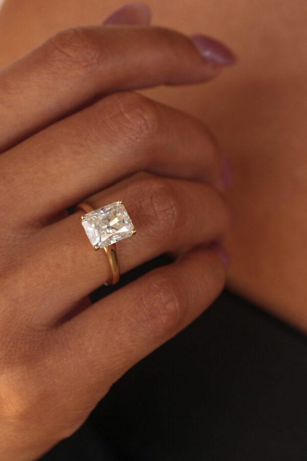 An emerald cut lab diamond engagement ring features a rectangular shape with stepped facets.