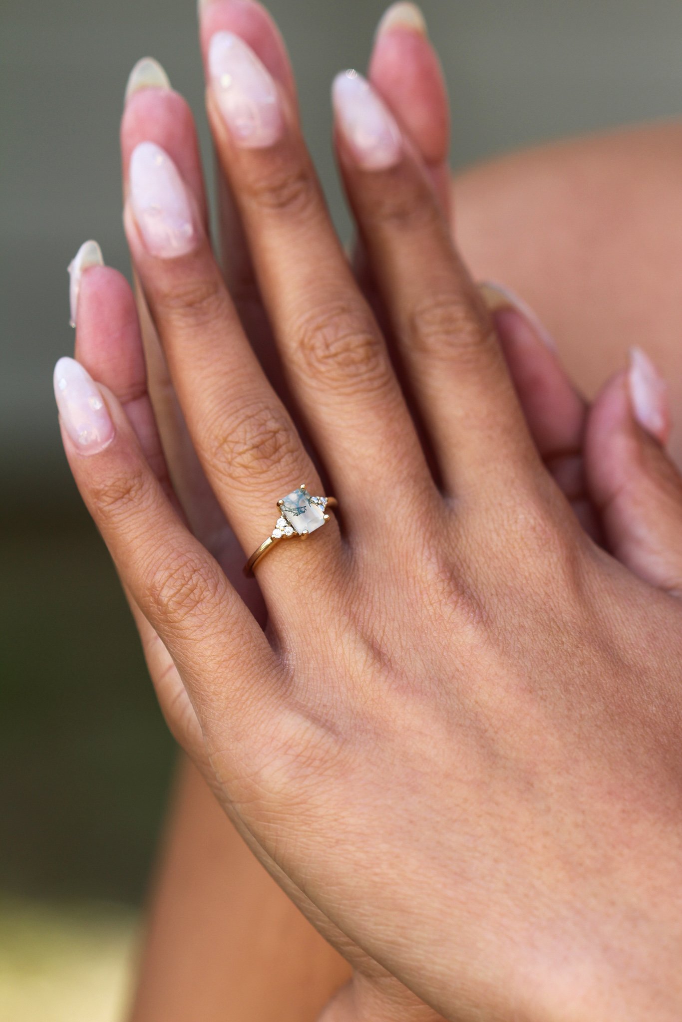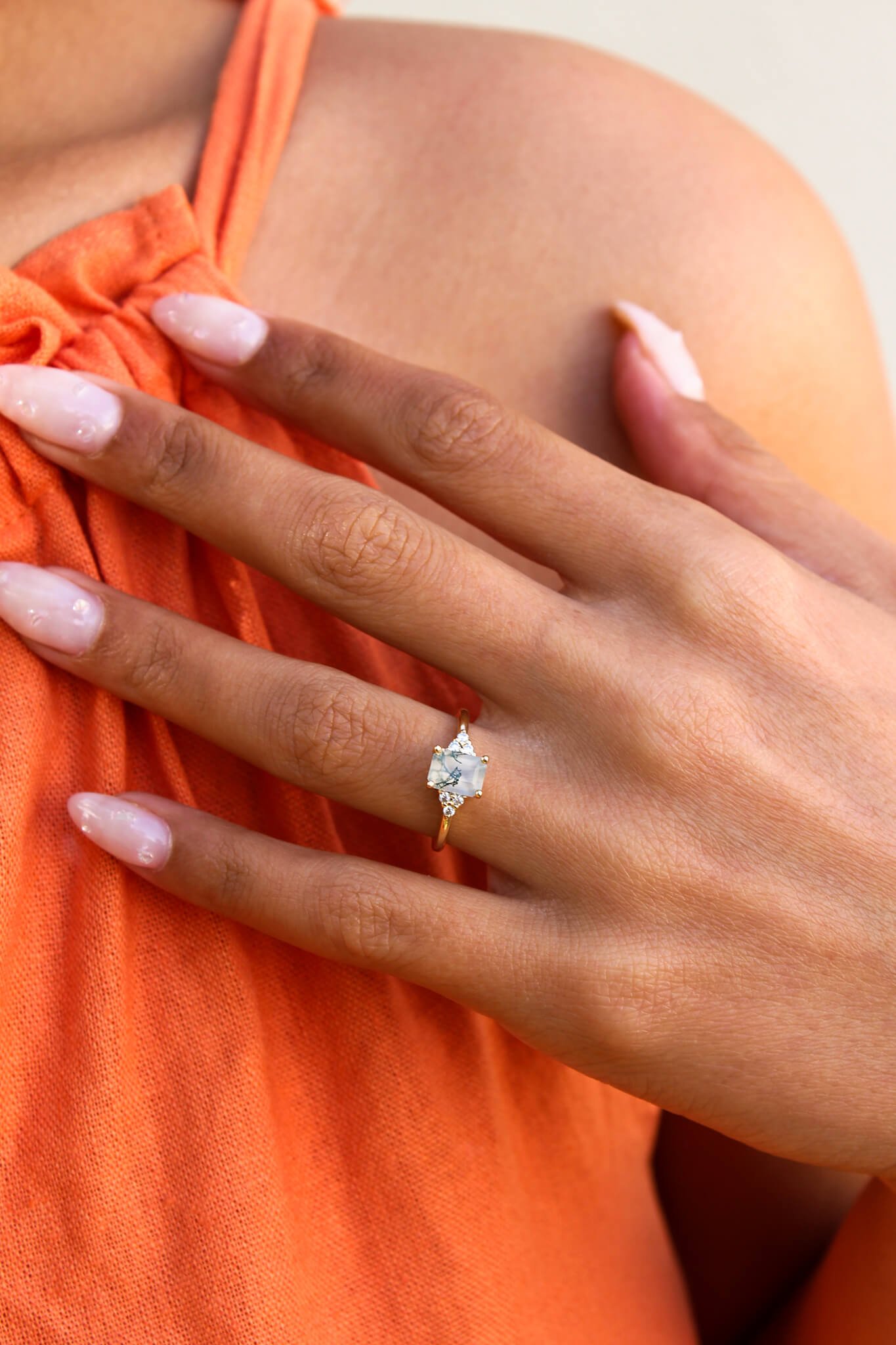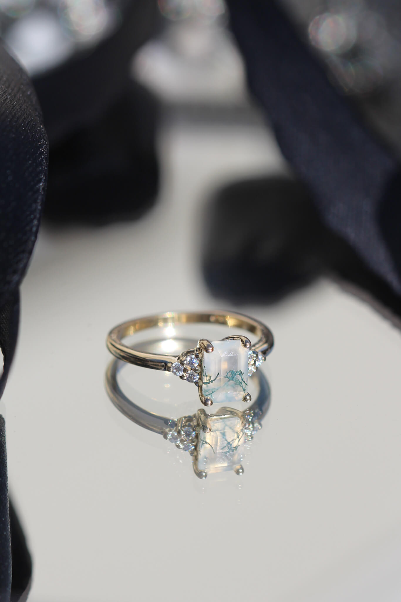 This Emerald Moss Agate Engagement Ring exhibits the beauty of a natural Moss Agate.