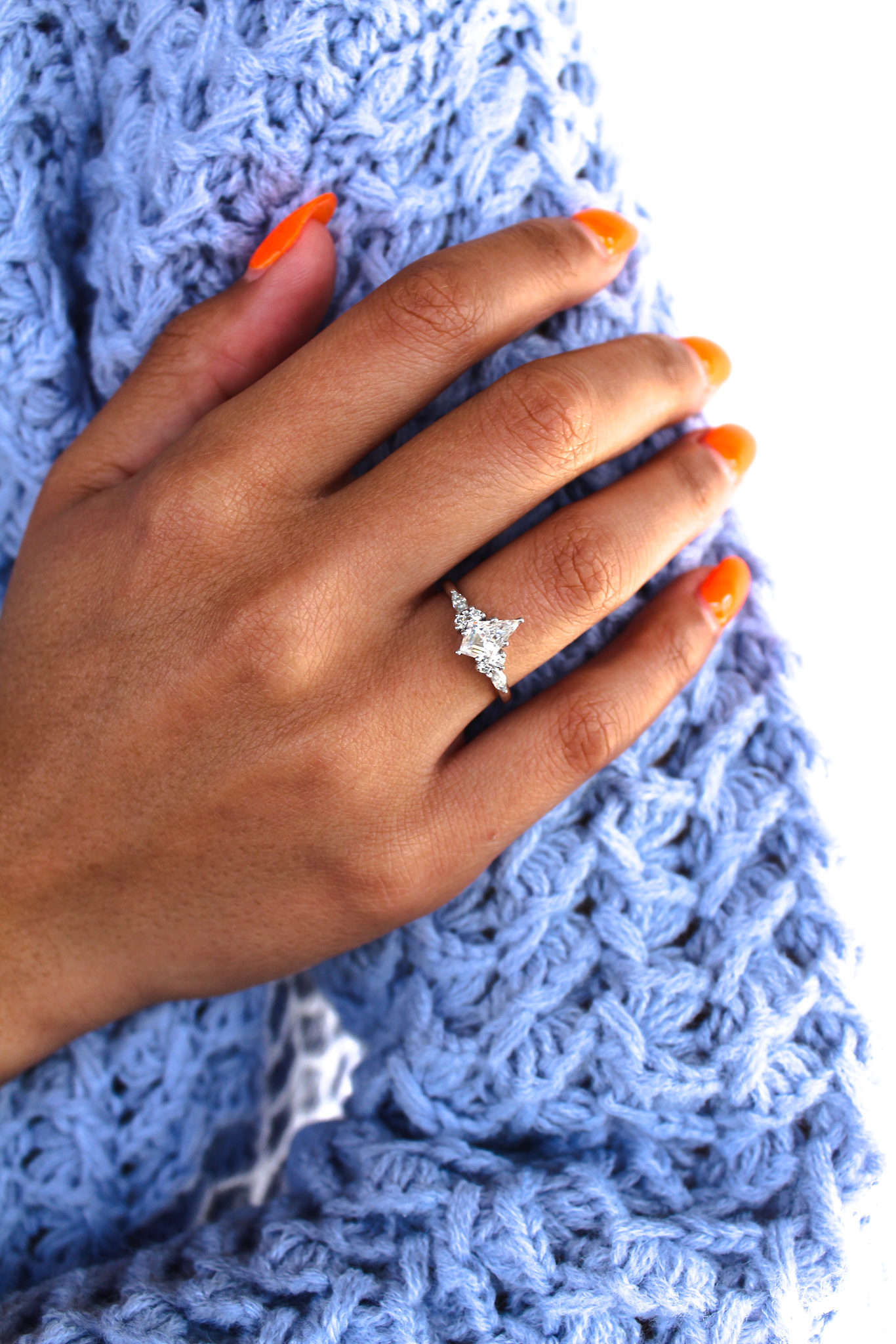 An edgy Art Deco inspired design is seen in our stunning Kite Cluster Moissanite Engagement Ring