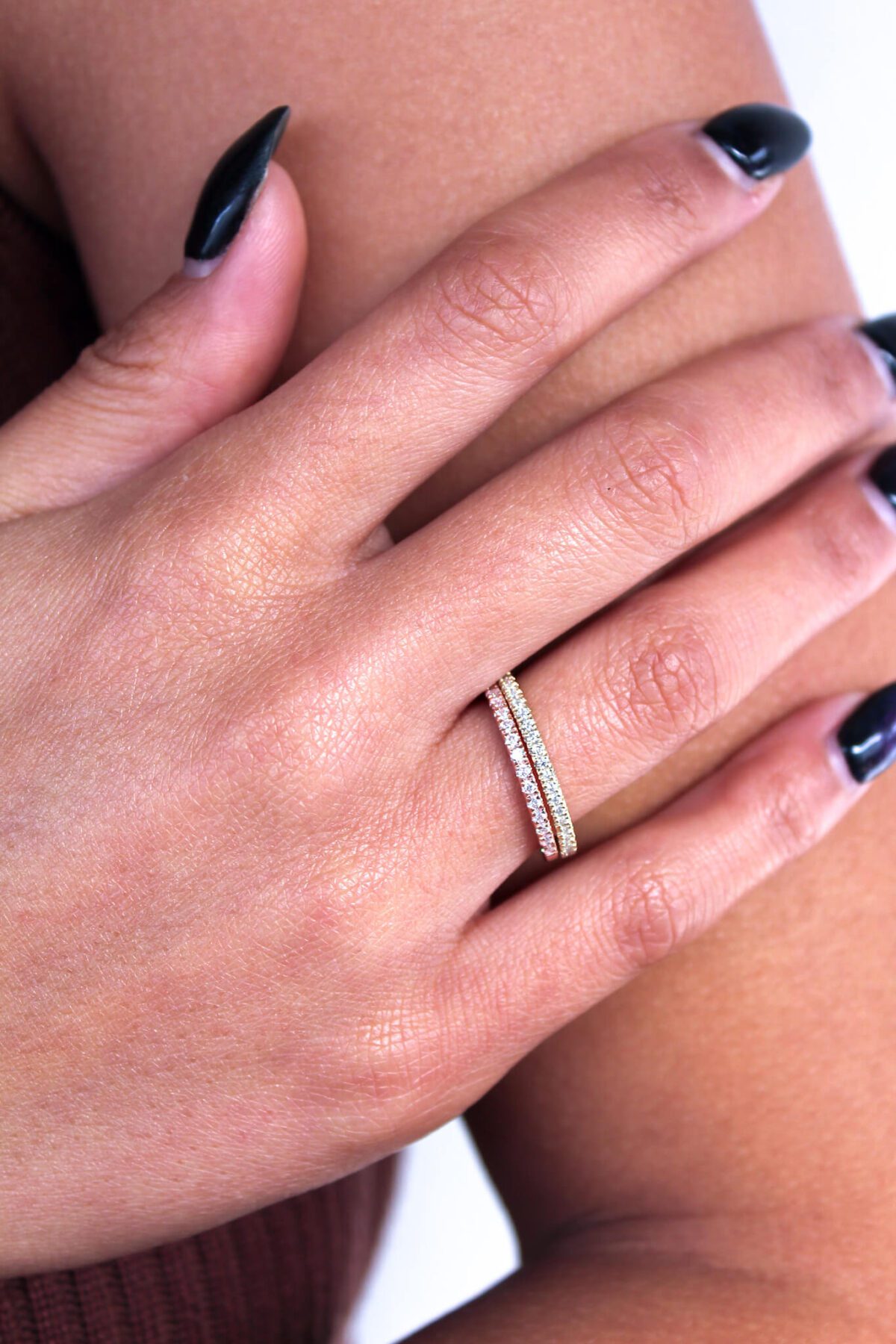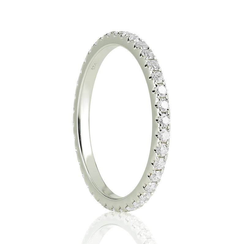This sparkly pave 1.5mm Moissanite Eternity Band is the perfect complement to any engagement ring and paired with other stackable bands.