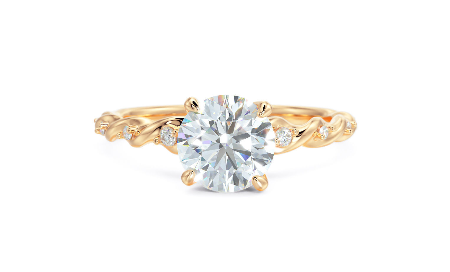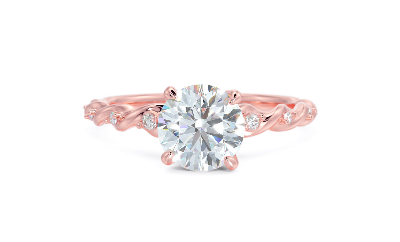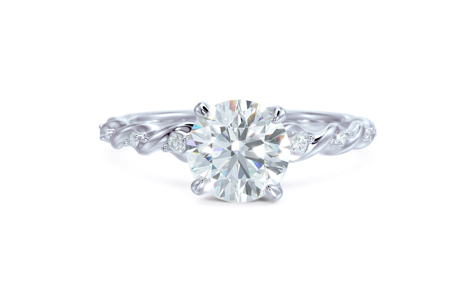 This Moissanite Solitaire Twist Engagement Ring is flanked by a selection of small round moissanites on a twist band with a stunning 0.80ct Moissanite centre stone.