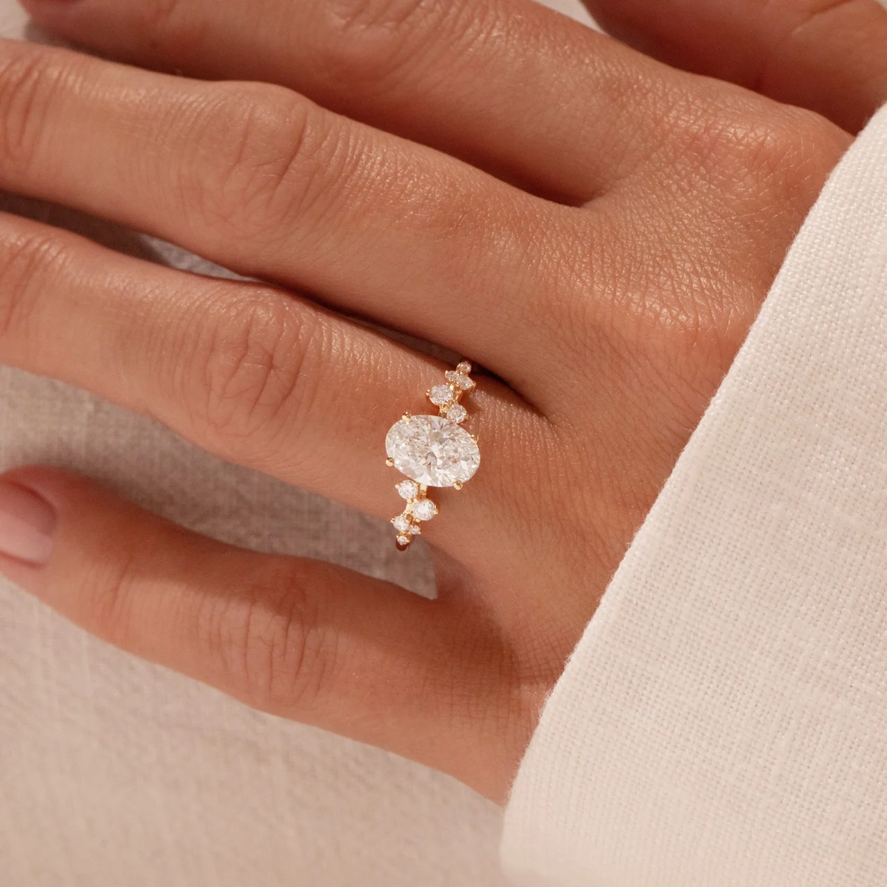 The cluster design combines a sparkling oval cut with delicate accent stones arranged like tiny blossoms around the center stone. The design is both playful and luxurious – perfect as an engagement ring for those seeking a special added detail.