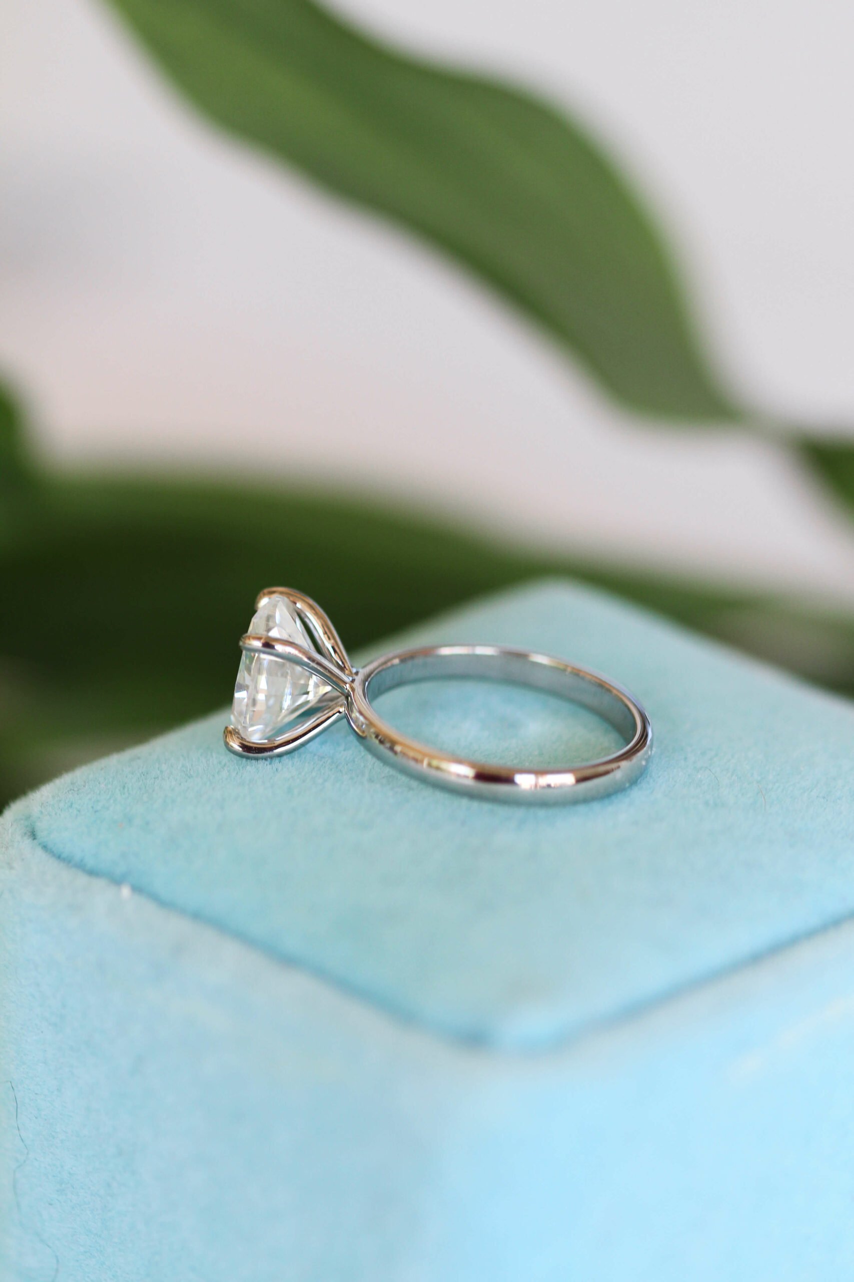 A modified version of the popular round brilliant cut, Our Brenna Oval Cut Moissanite Enagagement Ring has characteristics similar to the round cut. It’s elongated shape gives it the illusion of a bigger carat size.