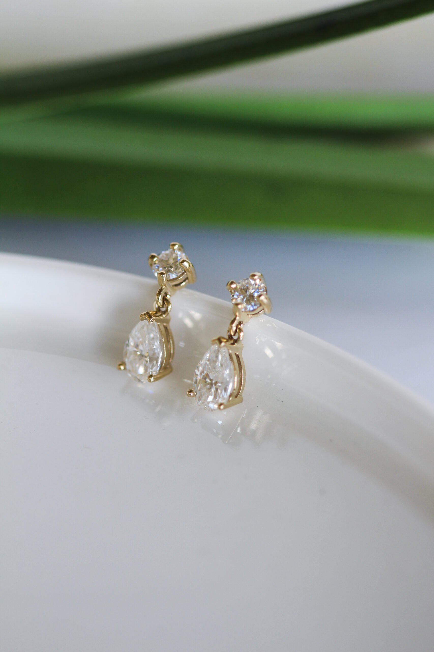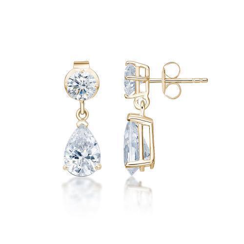 9ct Yellow Gold Claw Set Drop Earrings with Pear and Round Brilliant Cut Moissanites, total 2.40ct weight equivalent per pair. Measures approx 1.50cm in length, excellent for any occasion, Moissanite displays more brilliance than diamonds and is second only to diamonds for hardness which means its excellent durability perfect for daily wear Please Note: Total carat equivalent weight is per pair of earrings.- Style: Drop