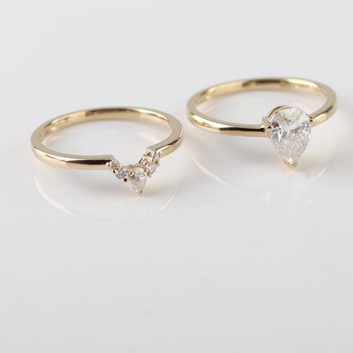 This enchanting duo features a captivating 5x7mm pear-cut moissanite, set in solid 9ct yellow gold, paired with a perfectly contoured V-shaped eternity band adorned with shimmering moissanite accents. Worn together, they create a beautiful harmony – distinctive, graceful, and endlessly romantic.