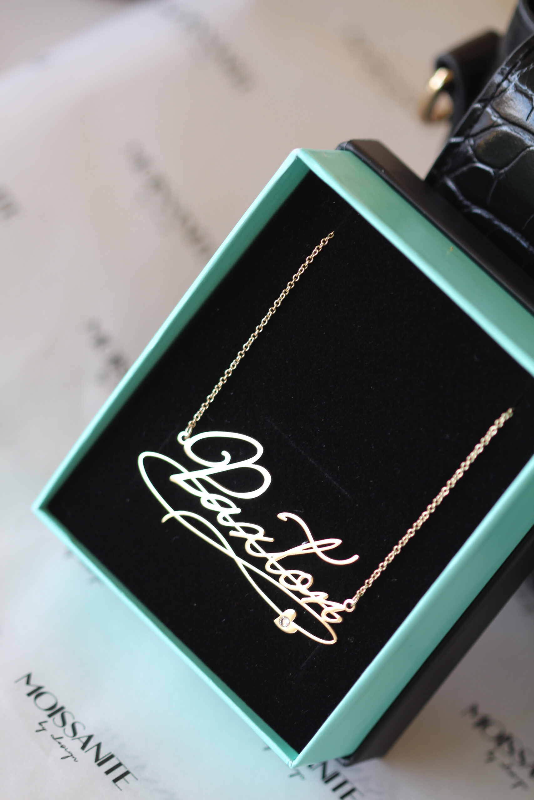 A meaningful and timeless piece with your name in elaborate signature script. This stunning necklace features a 45cm chain. Personalise it with a moissanite gemstone or a birthstone for a more unique touch.
