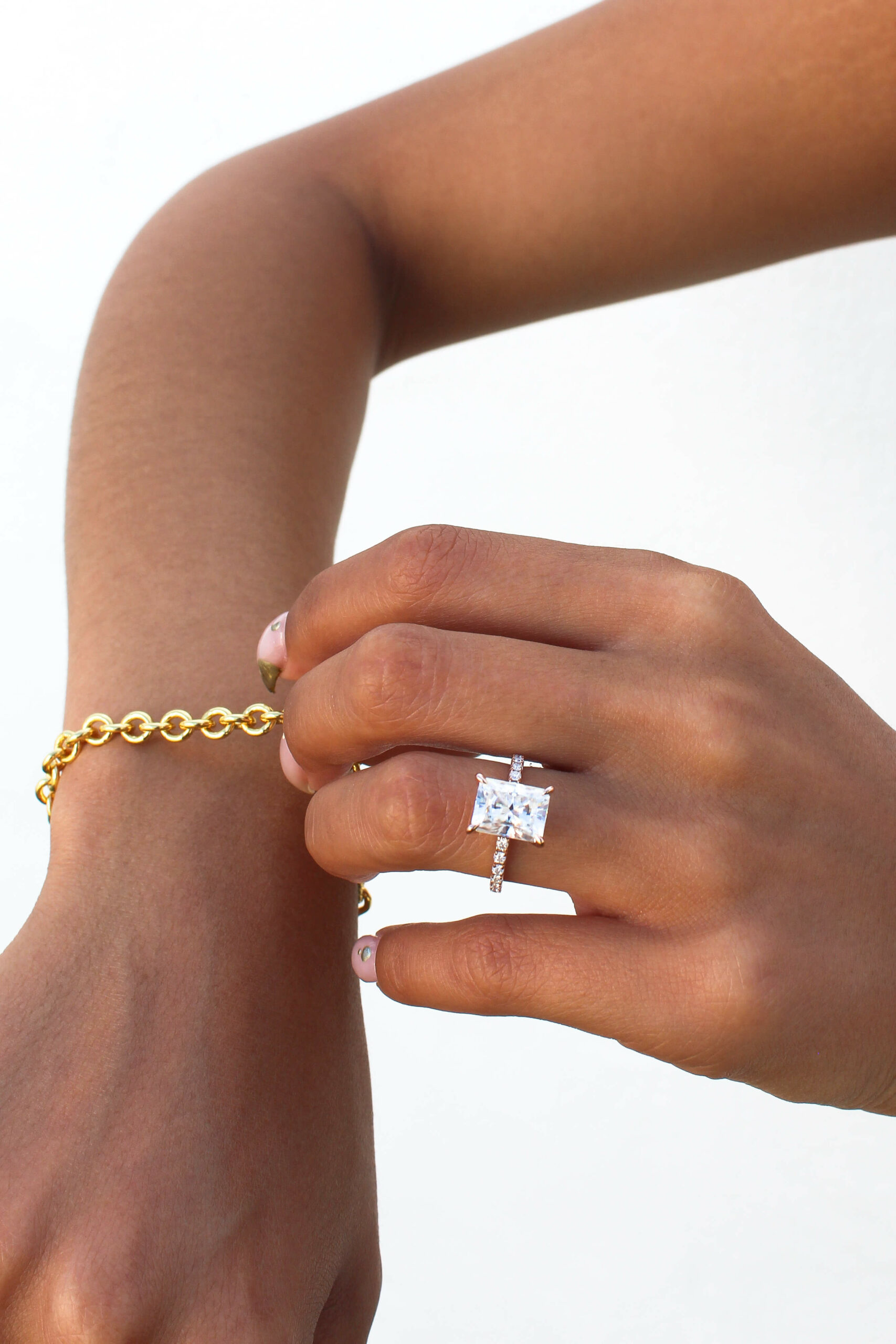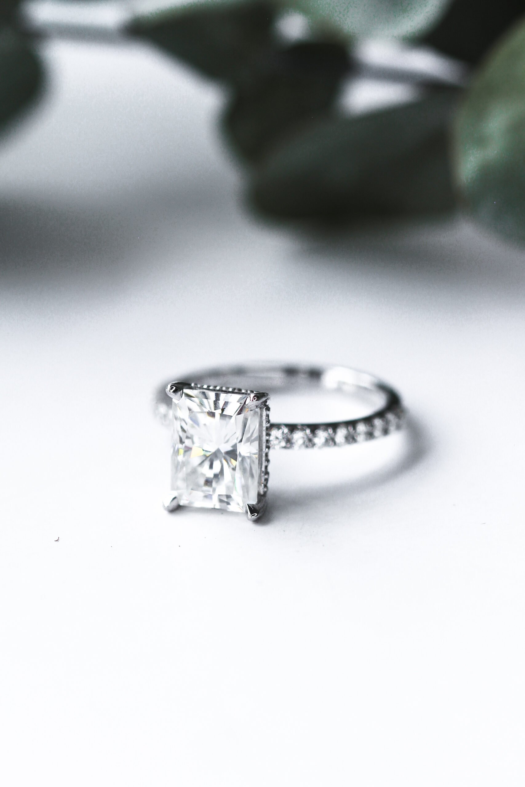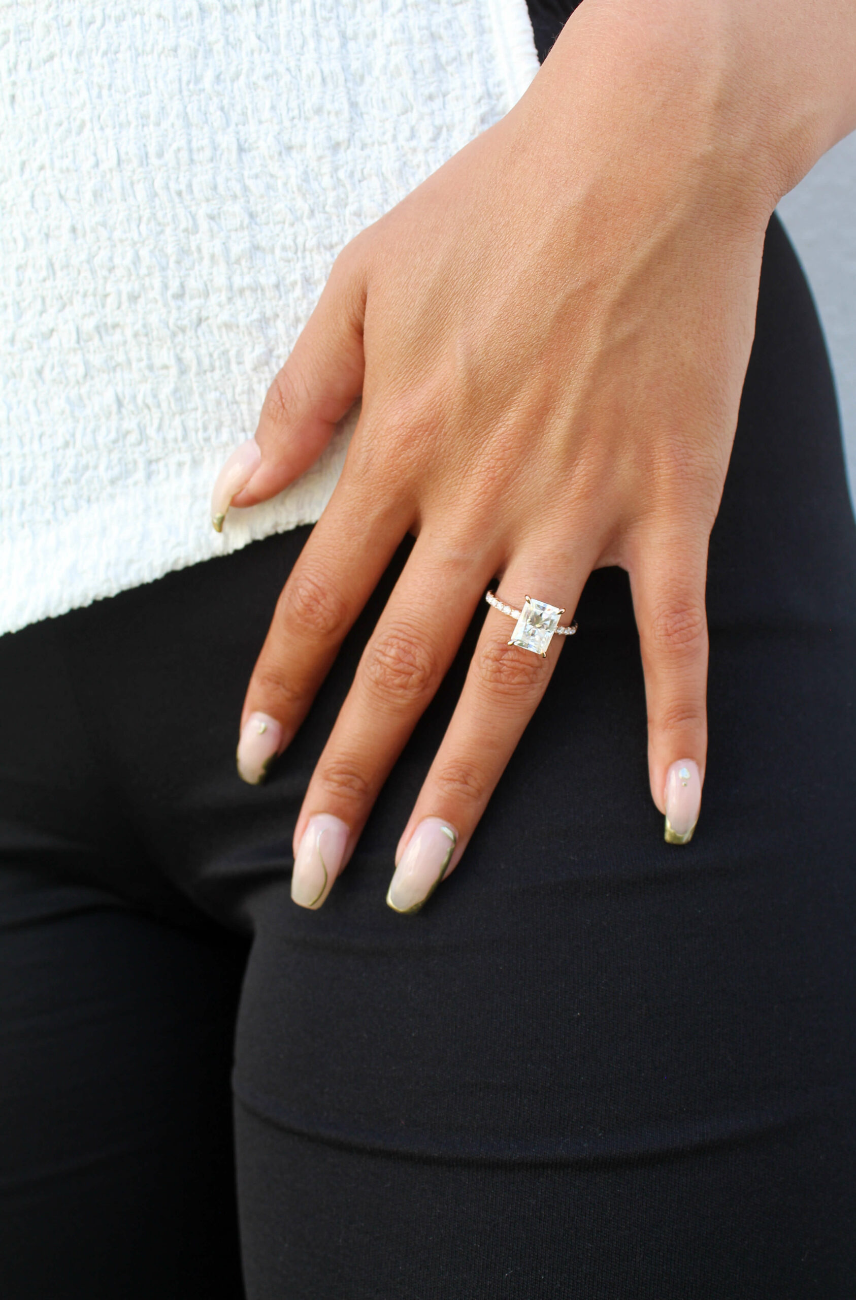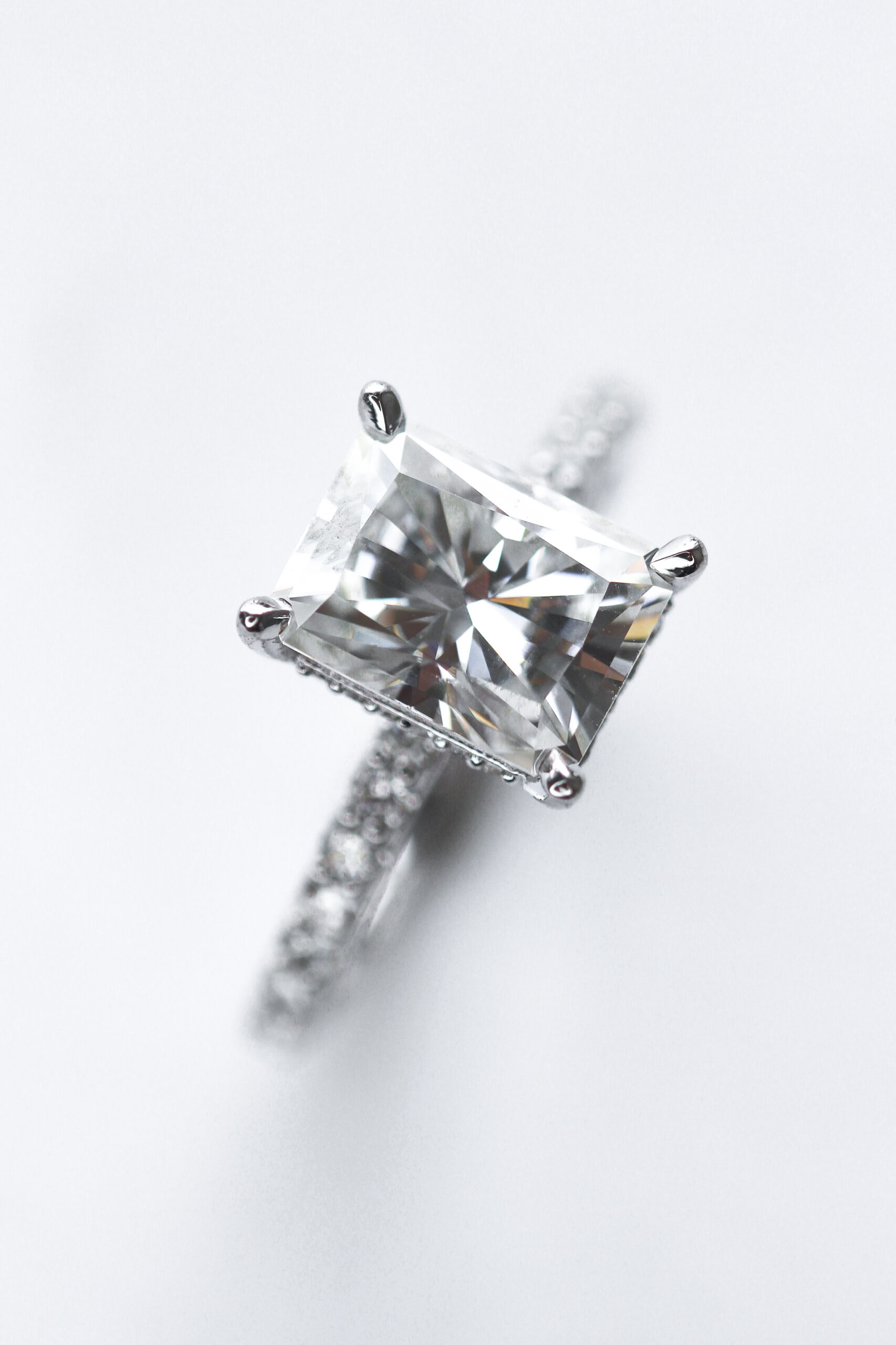 Shining brilliantly with a 5ct solitaire radiant cut center stone, this Radiant Cut Hidden Halo Ring design is a gorgeous way to upgrade your engagement or wedding ring!