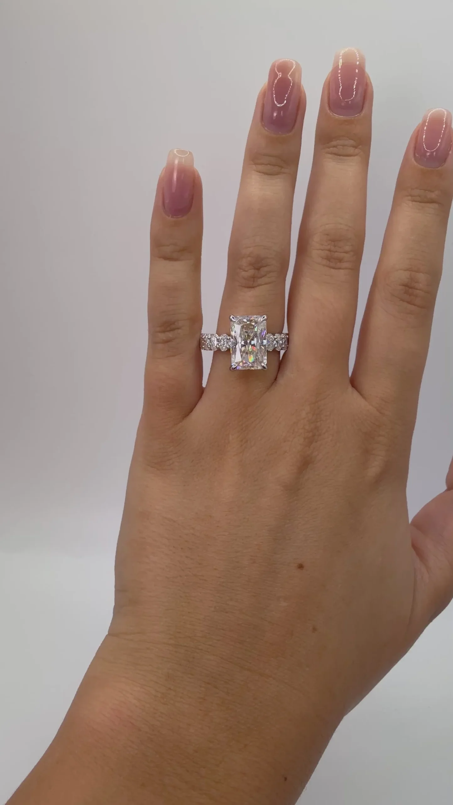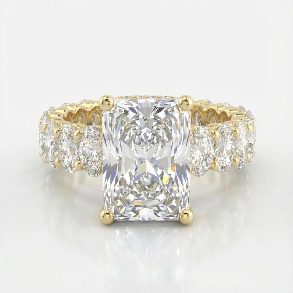 Your ring is made to order. Turnaround is 4-6 weeks. • Metal: Solid 9ct Gold • Stone: Moissanite • Shape: Radiant • Colour: G (Near Colorless) • Clarity: VVS1 • Stones Sizes : 8x11mm ( approx 4ct Diamond Equivalent Weight) + 14pcs 3x4mm oval moissanites or lab diamonds • Band Width: 4.5mm (with +/- 0.1mm variation)