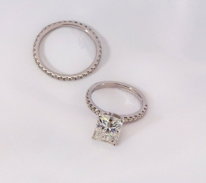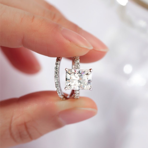 Shining brilliantly with a 5ct solitaire radiant cut moissanite as the star of the show, flanked by small round moissanites in this pave setting – This gorgeous Radiant Cut Wedding Set is the perfect way to upgrade your wedding ring or wedding ring set!