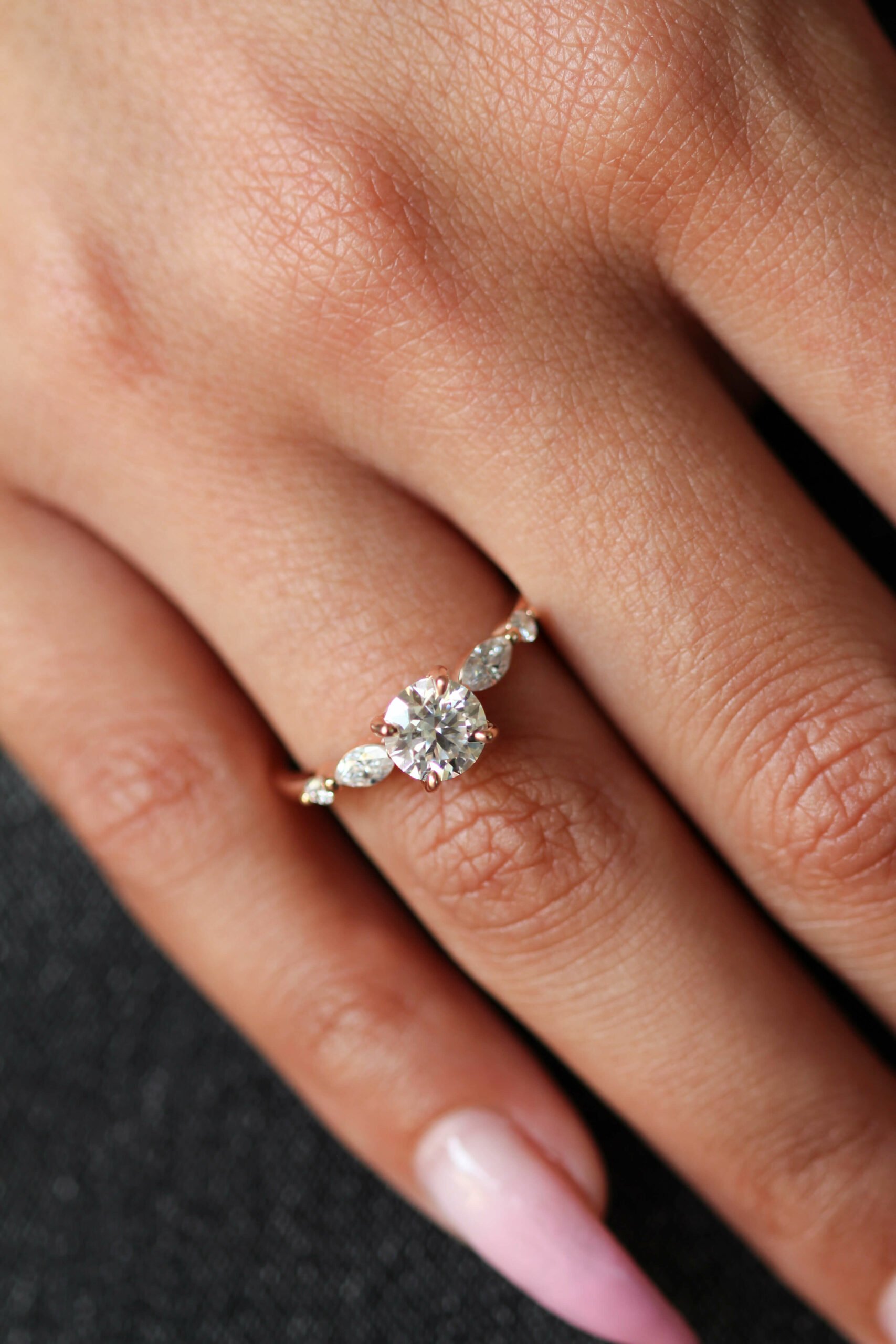 Your Round Marquise Cluster Engagement Ring is made to order. Turnaround is 2-3 weeks. • 1ct Round Brilliant Cut Moissanite Cluster Engagement Ring Set in 14ct Rose Gold: • Metal: Solid 14ct Rose Gold • Centre Stone: Moissanite / Size/Weight: 6.5mm (Approx. 1ct) Round Moissanite • Colour: G (Near Colourless) • Clarity: VVS1 • Side stones: Cut – Marquise 2 x 2.5mmx5mm + Round 2 x 2mm round cut moissanites Choose between various of metal options, this Stunning Round Marquise Cluster Engagement Ring is pictured in 9ct rose gold, but with a choice to customize the ring in a different colour fancy moissanite stone or a different type of metalMoissanite Engagement Rings South Africa