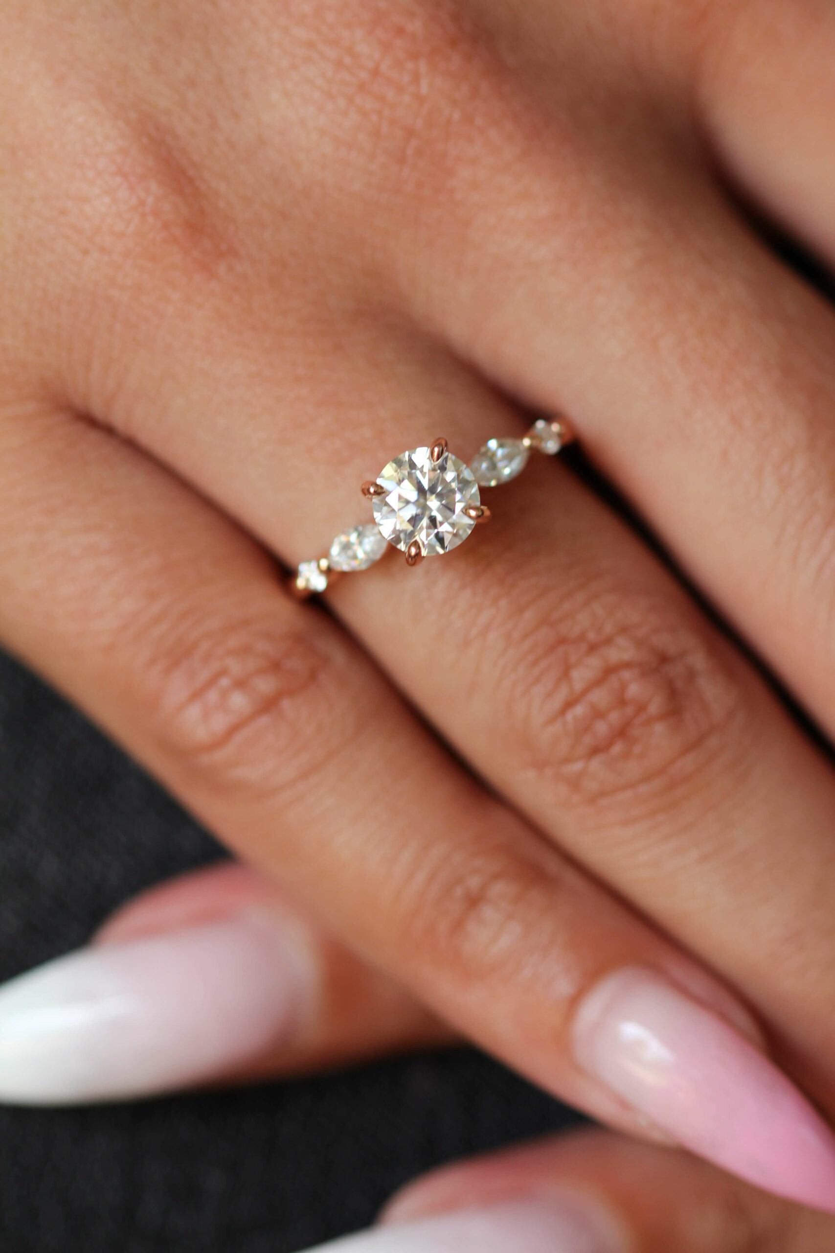 For an even more meaningful proposal, our Round Marquise Cluster Engagement Ring with a 4 claw setting hold a cluster of marquise and round moissanites to accentuate the centre round brilliant near colorless moissanite