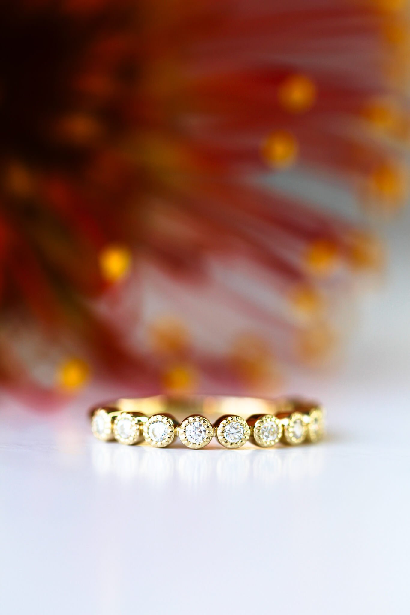 This beautiful beaded bezel eternity band is inspired by timeless vintage style and features shimmering moissanites all the way around. Set in premium yellow gold, each stone is wrapped in delicate detail, creating a mesmerizing ring that’s perfect for stacking or wearing solo. This majestic Round Vintage Bezel Moissanite Eternity Ring is elegant, romantic, and made to shine every day.