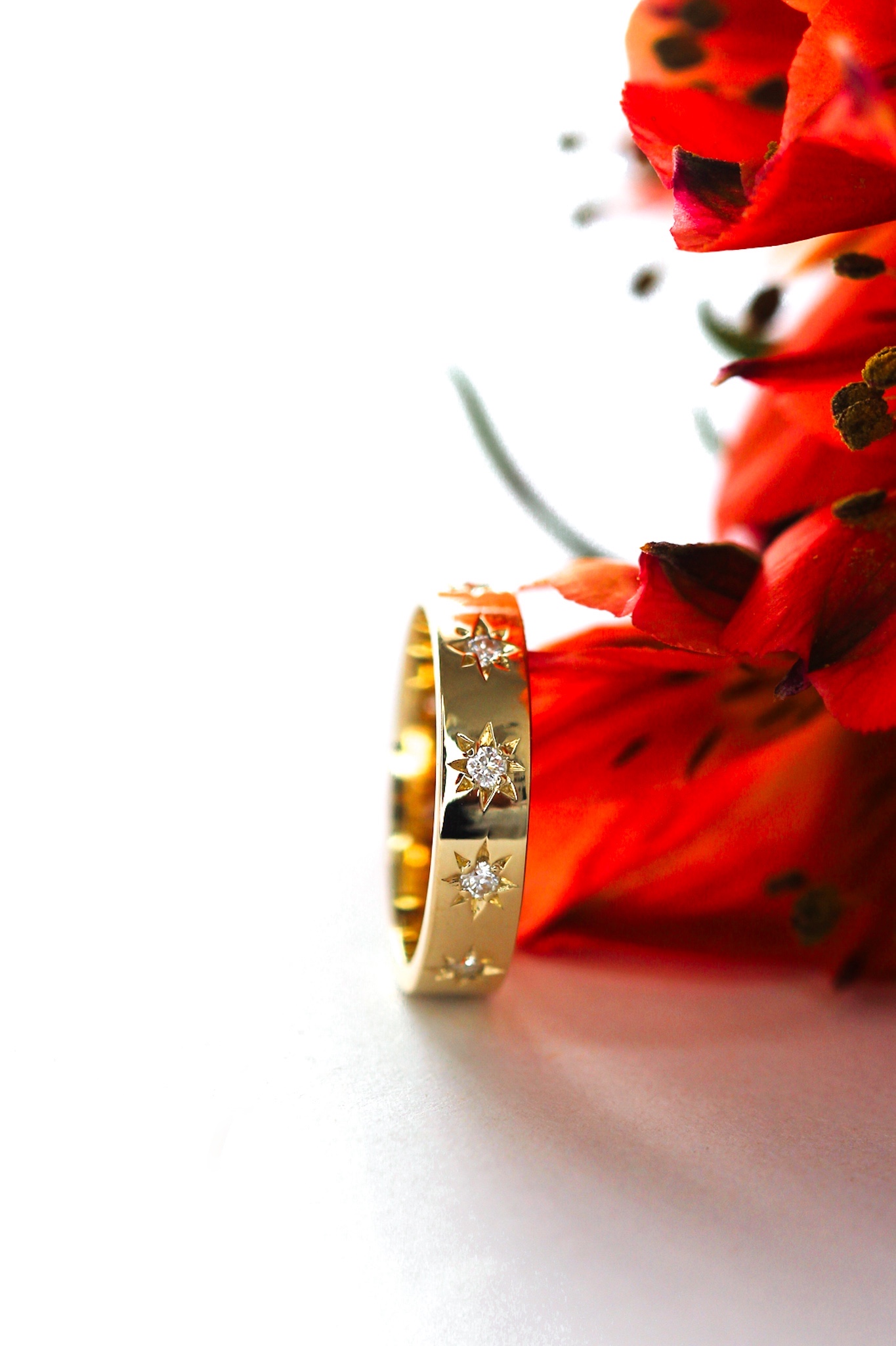 Feel like a shining star in our solid gold starstruck ring. The ring features a thick gold band adorned with seven round moissanite set in a striking engraved starry sparkle design.