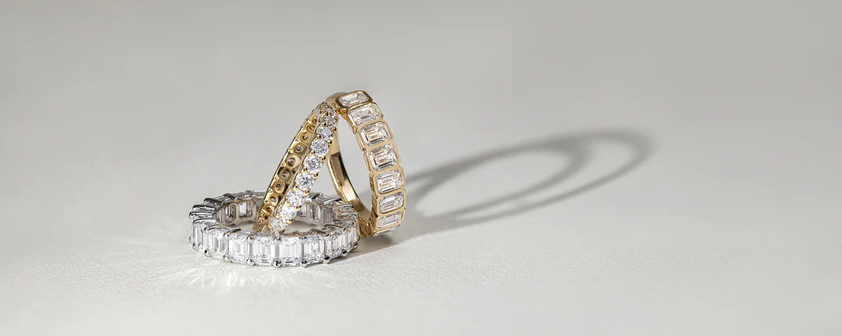 Choose from sleek classic bands, pavé-set designs, or custom creations that complement your engagement ring perfectly.